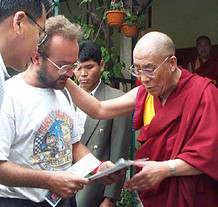 Chris & Marty sind schon weit gereist! Sie unterstützen den Weltreisenden Simon Milward, der seit dem 1.1.2000 die ganze Welt bereist um für Ärzte ohne Grenzen, Riders For Health und andere Hilfsorganisationen Geld zu sammeln und zu arbeiten. Im Bild treffen die 3 auf Seine Heiligkeit den Dalai Lama.